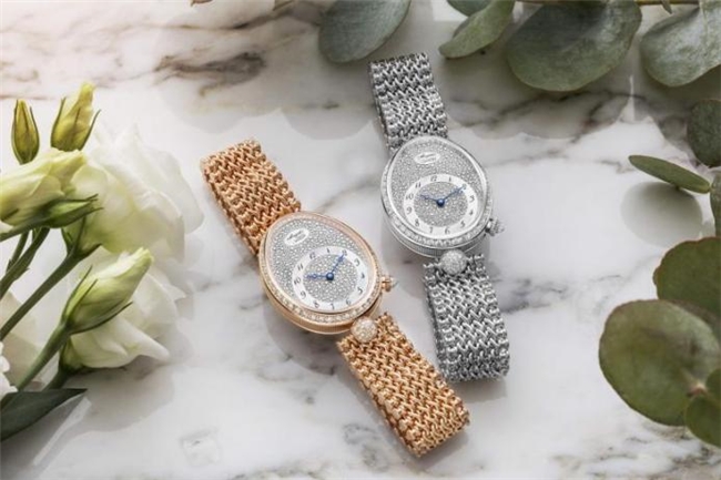 宝玑Reine de Naples那不勒斯王后系列 8938 腕表玫瑰金链带款延续了宝玑初代鹅蛋形时计的特点。位于 6 点钟位置的偏心白色珍珠母贝小时刻度圈为宝玑Reine de Naples 那不勒斯王后系列 8938 腕表的表盘再添魅力。宝玑经典数字时标与隽永宝玑指针在表盘上“翩跹共舞”。镶嵌工艺亦运用于表盘内缘、表圈和由明亮式切割钻石装点的表耳,表冠镶嵌一颗水滴型切割钻石。雪花镶嵌表盘,精美华丽,映衬女性的魅力光芒。